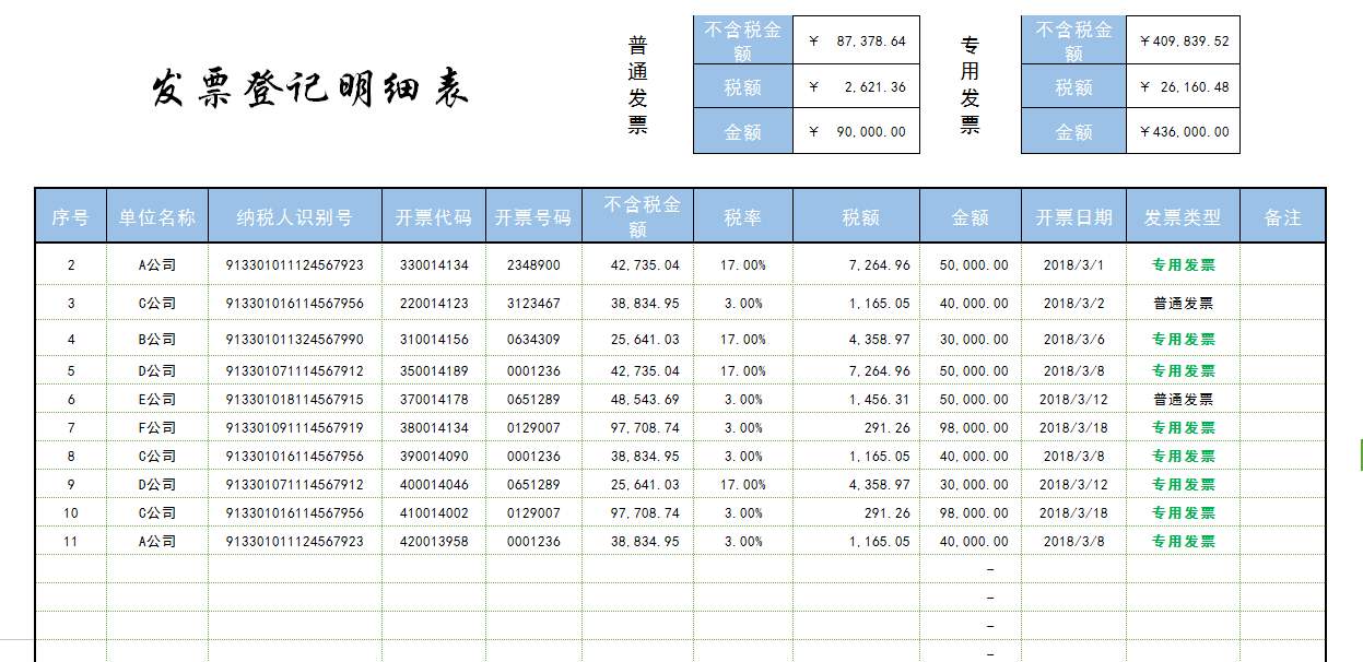 发票登记明细表(分类计算)Excel表格模板