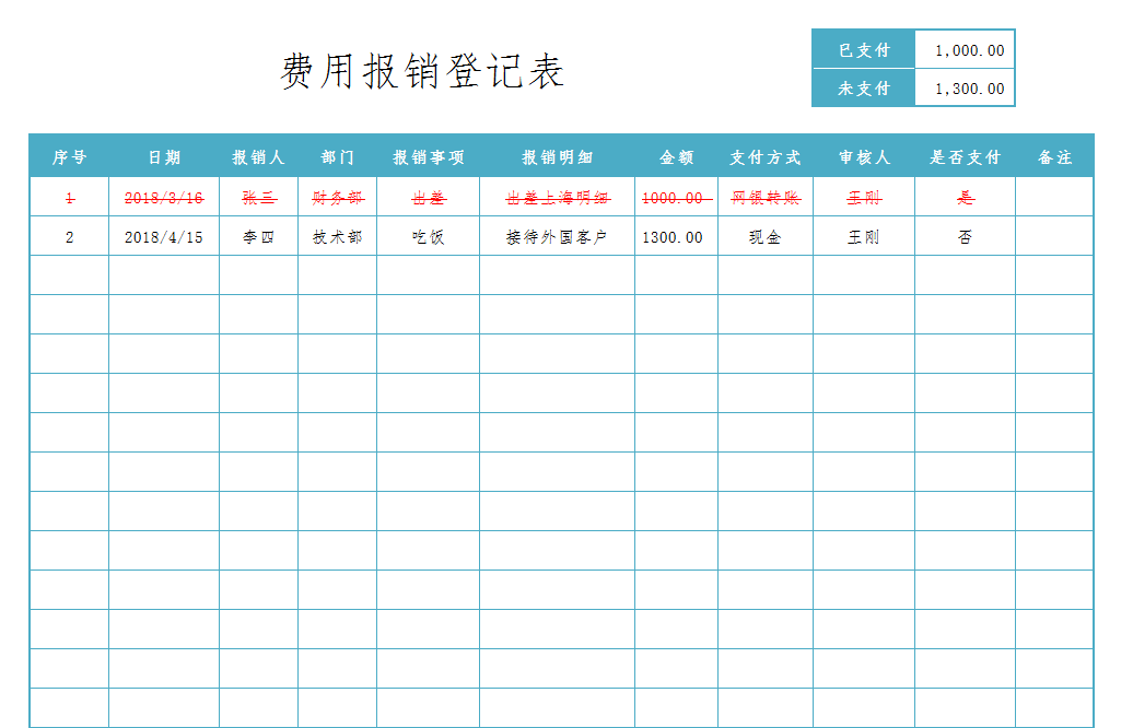费用报销登记表自动统计金额Excel表格模板
