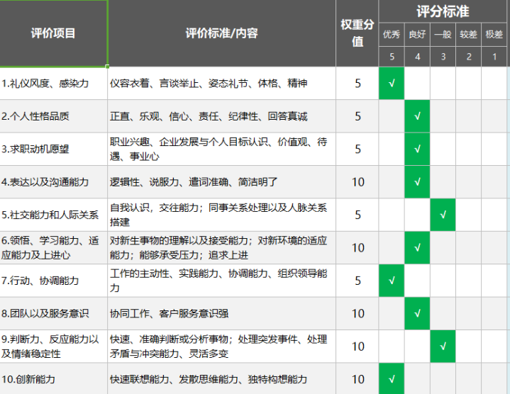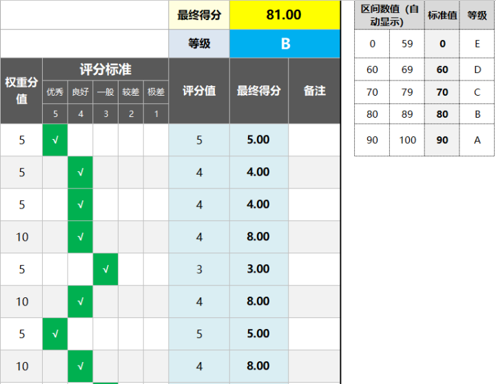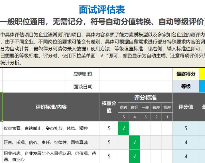 面试评估表(输入符号即可无需记分自动等级评价)Excel表格模板