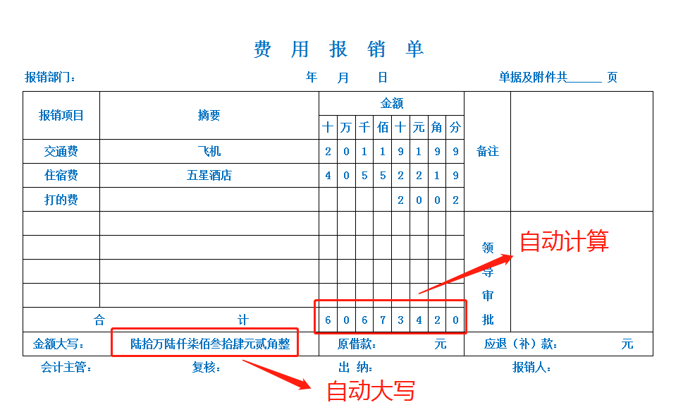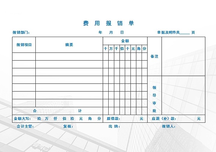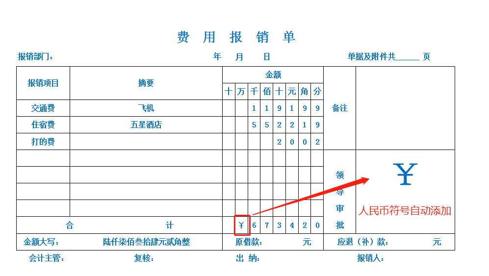 通用标准蓝色费用报销单excel电子模板自动计算汇总金额自动大写