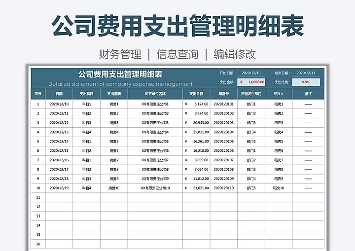费用报销登记表自动统计金额Excel表格模板