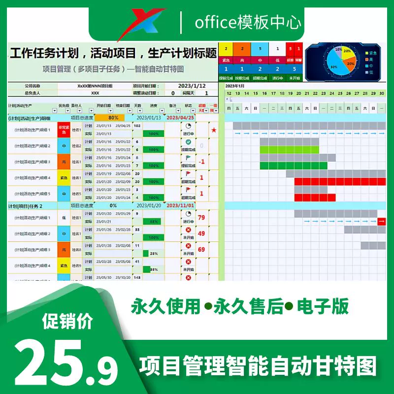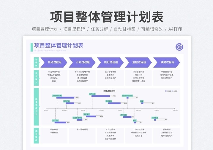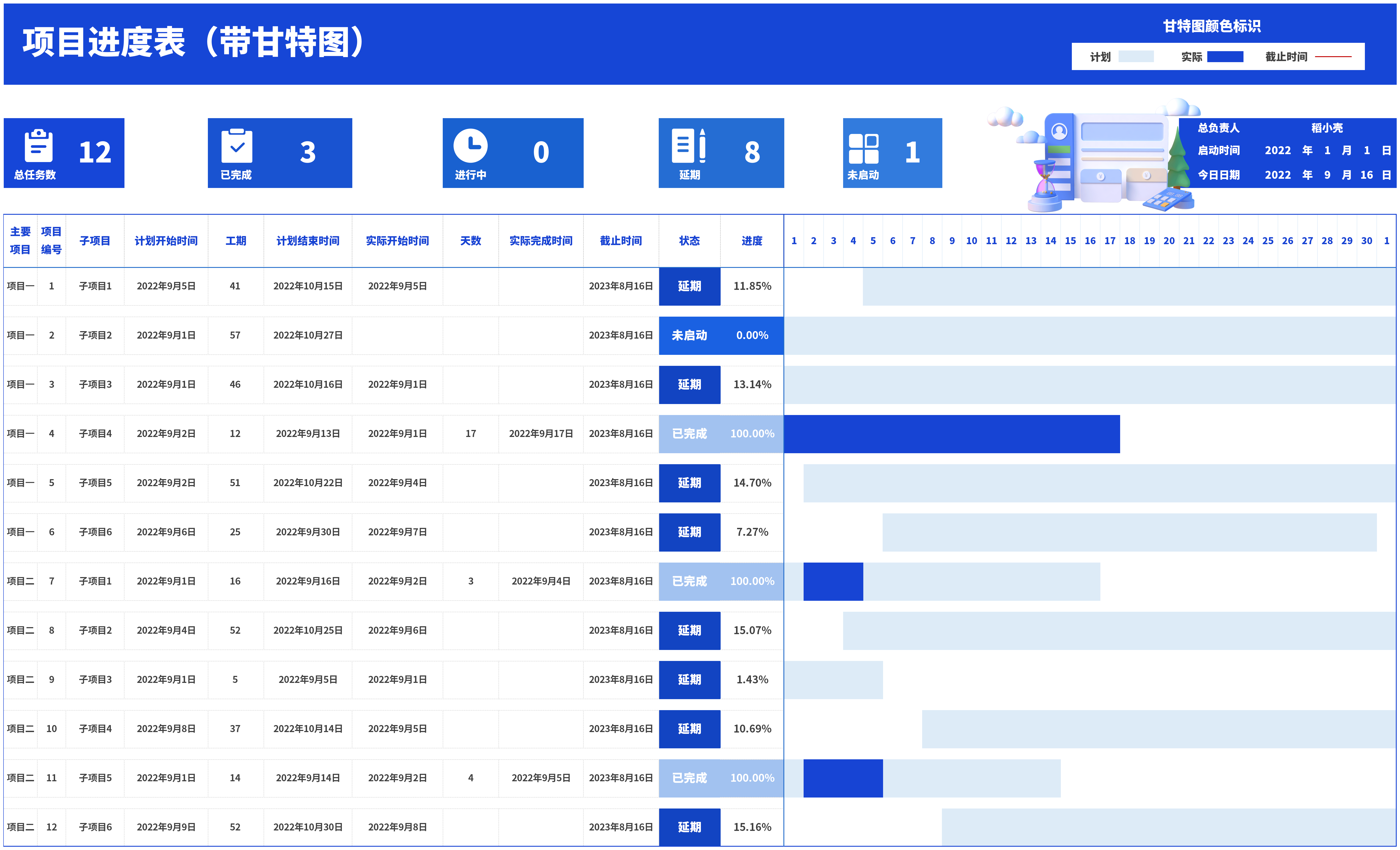 excel-项目管理进度甘特图模板(日+周+月进制版)