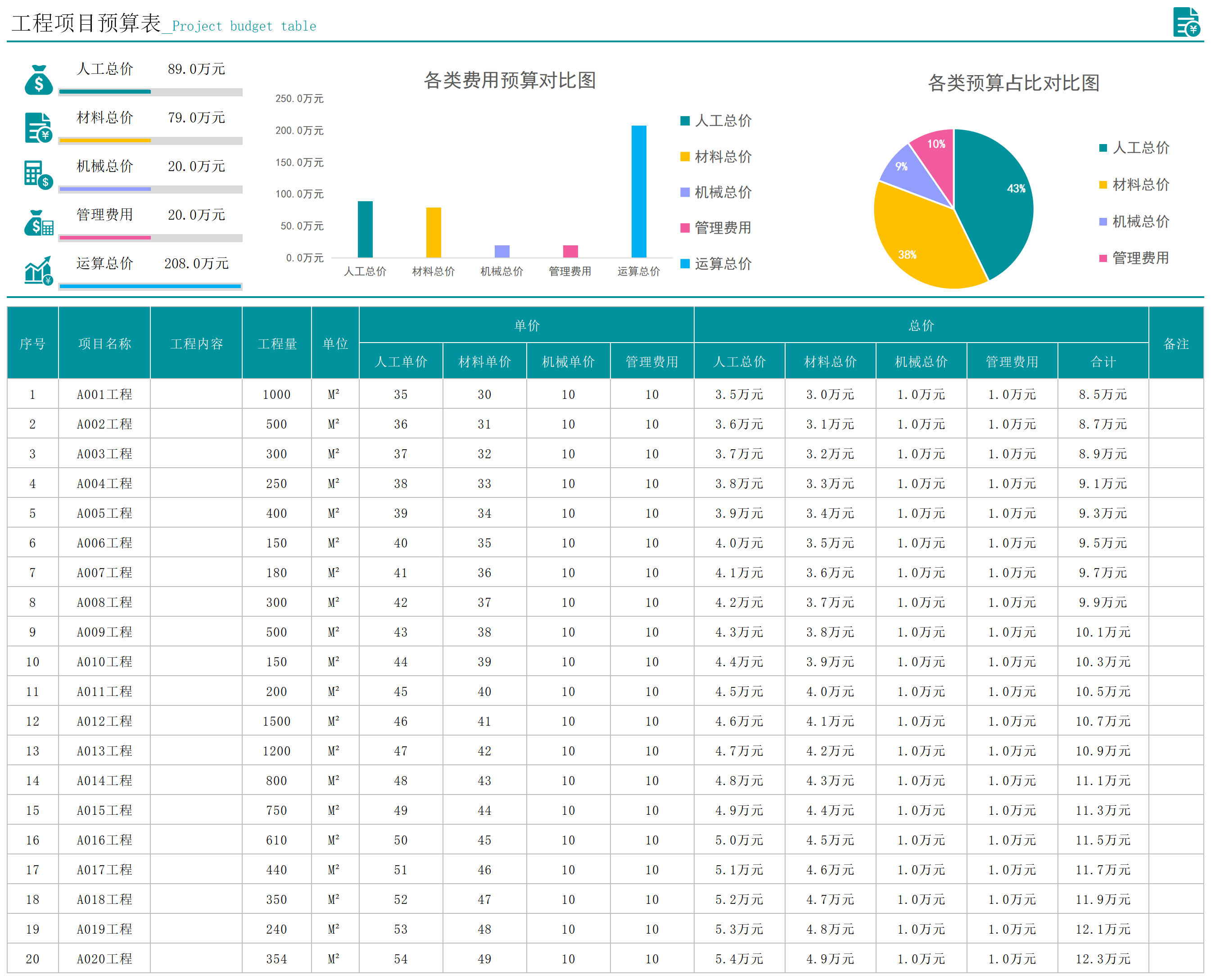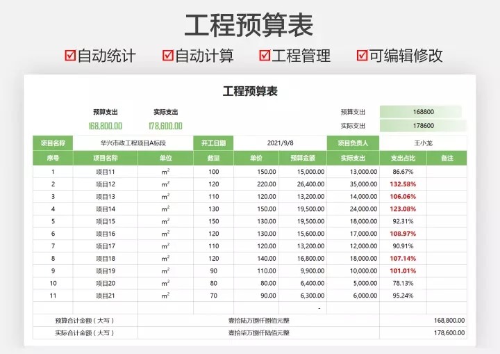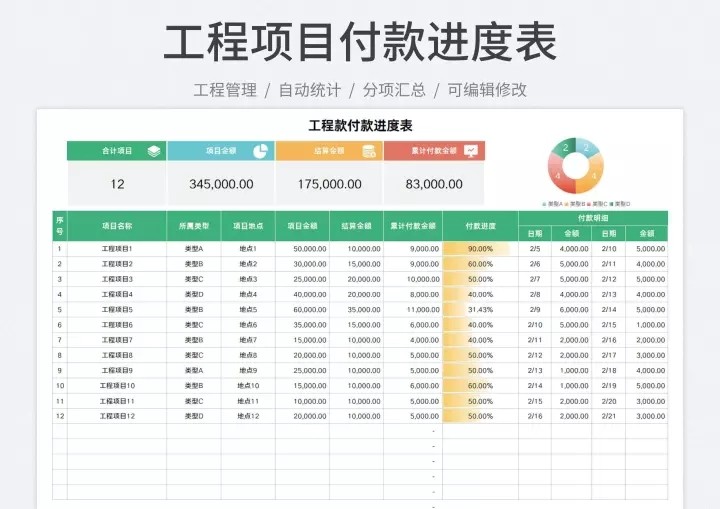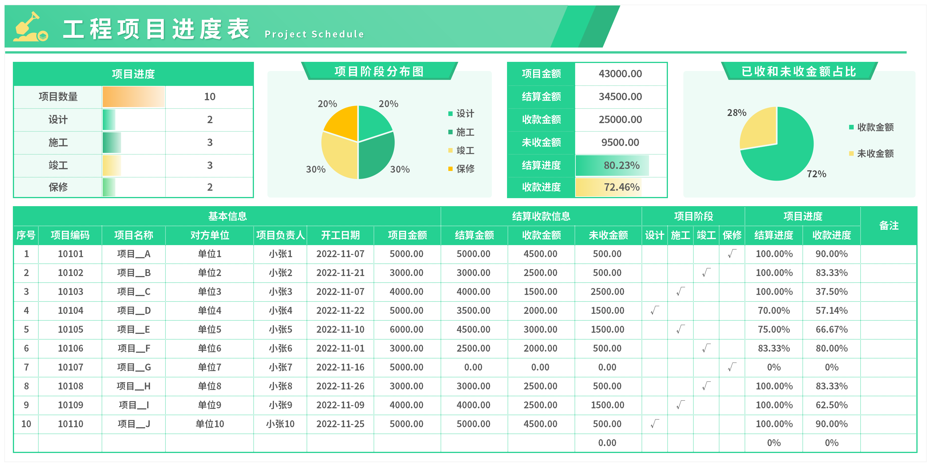工程项目管理Excel表格结算单工程成本预算施工横道图进度甘特图