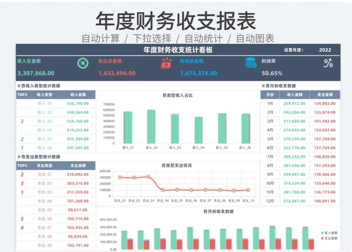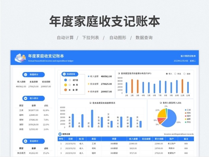 简易收支记账登记明细Excel表格财务全年收入支出系统实时分析