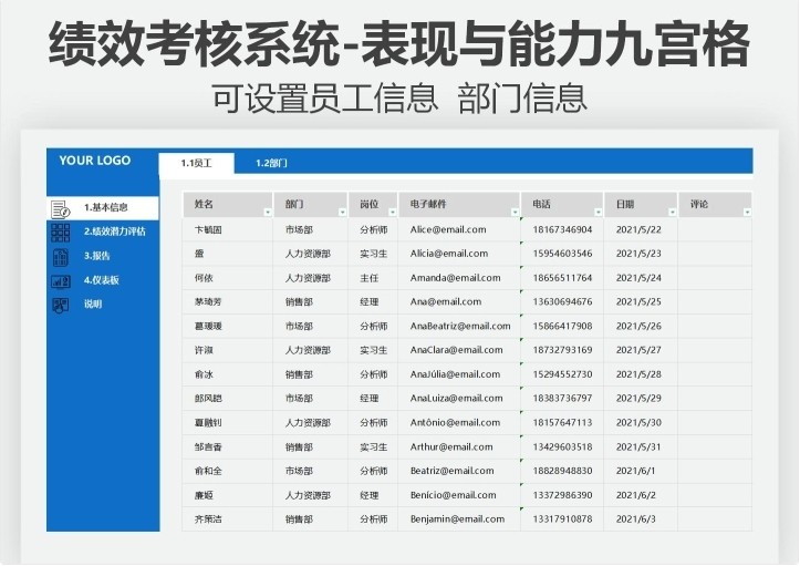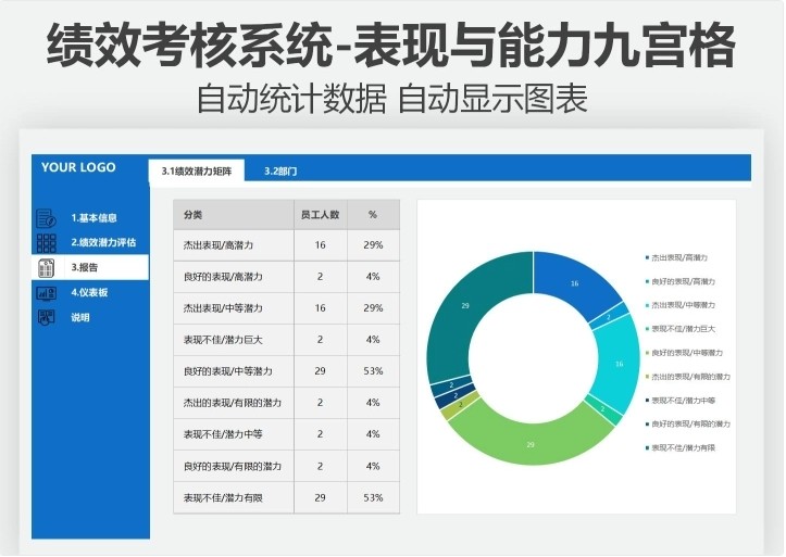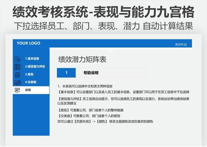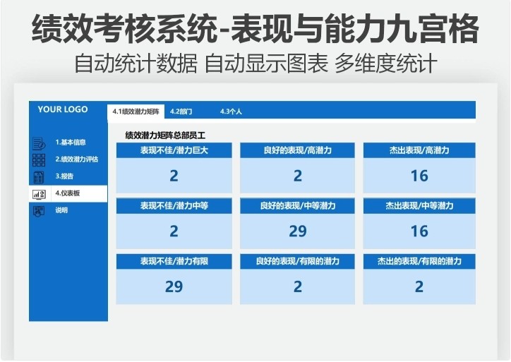 绩效考核Excel系统绩效潜力评估表现与能力九宫格自动多维度统计