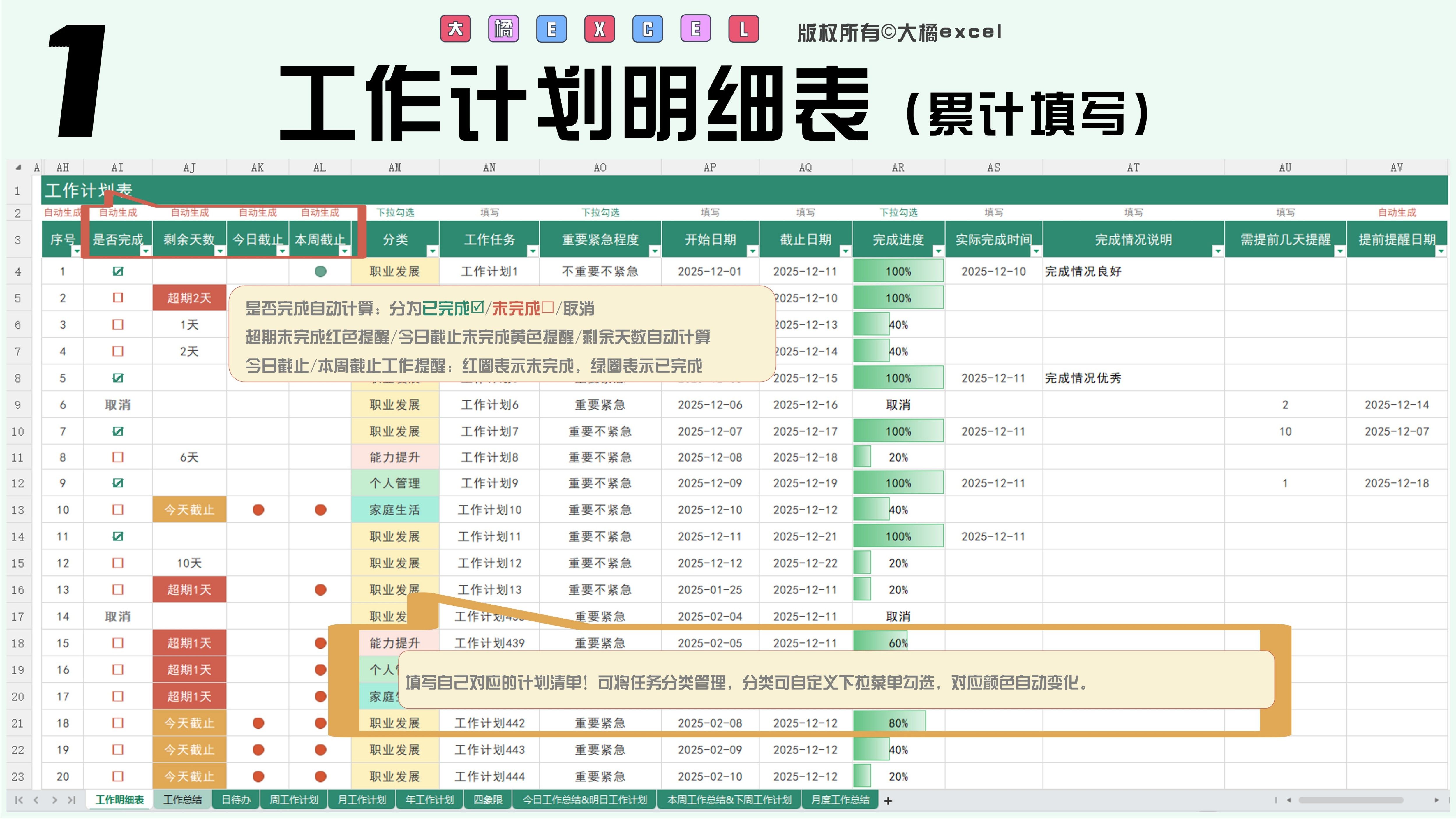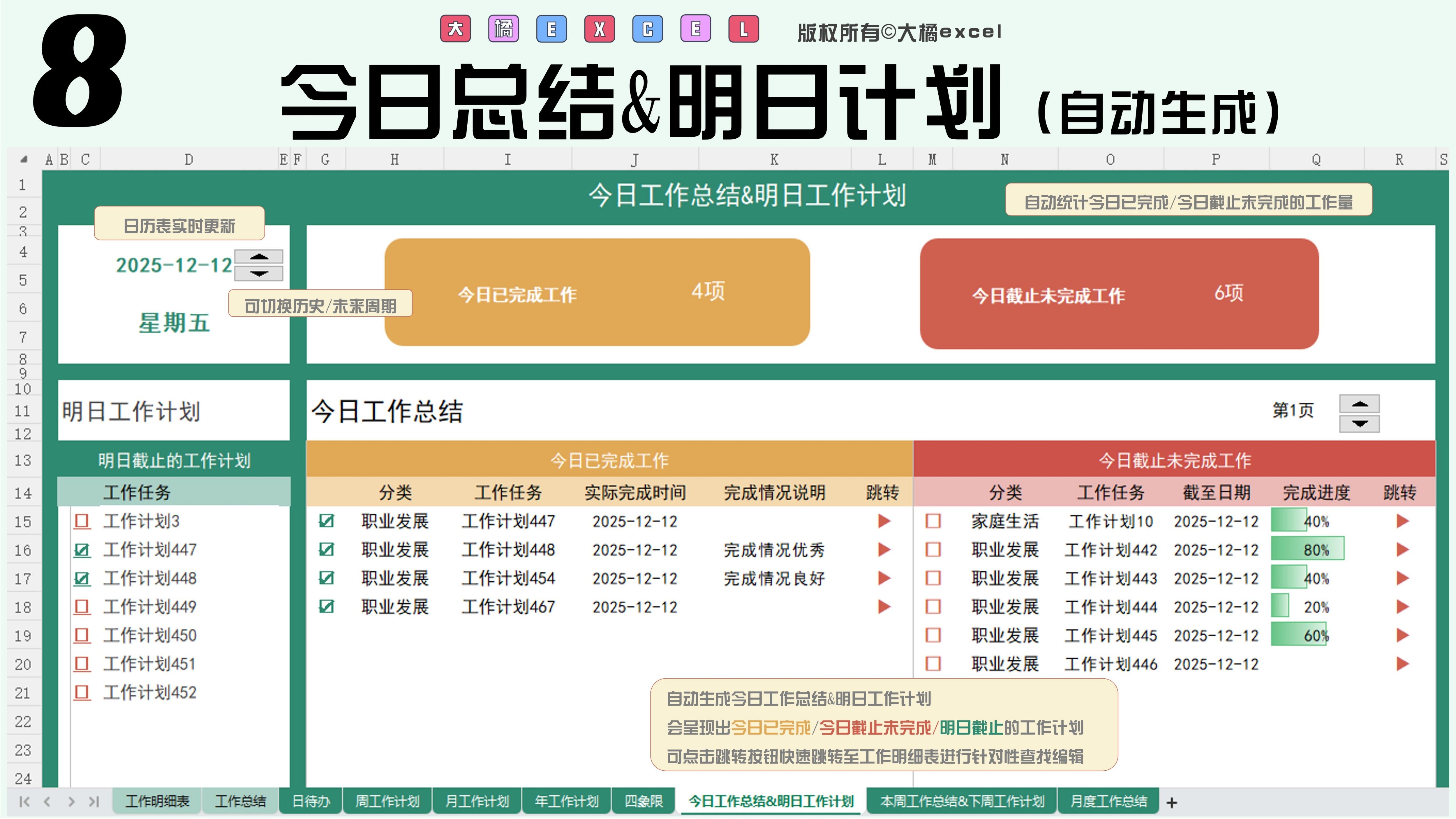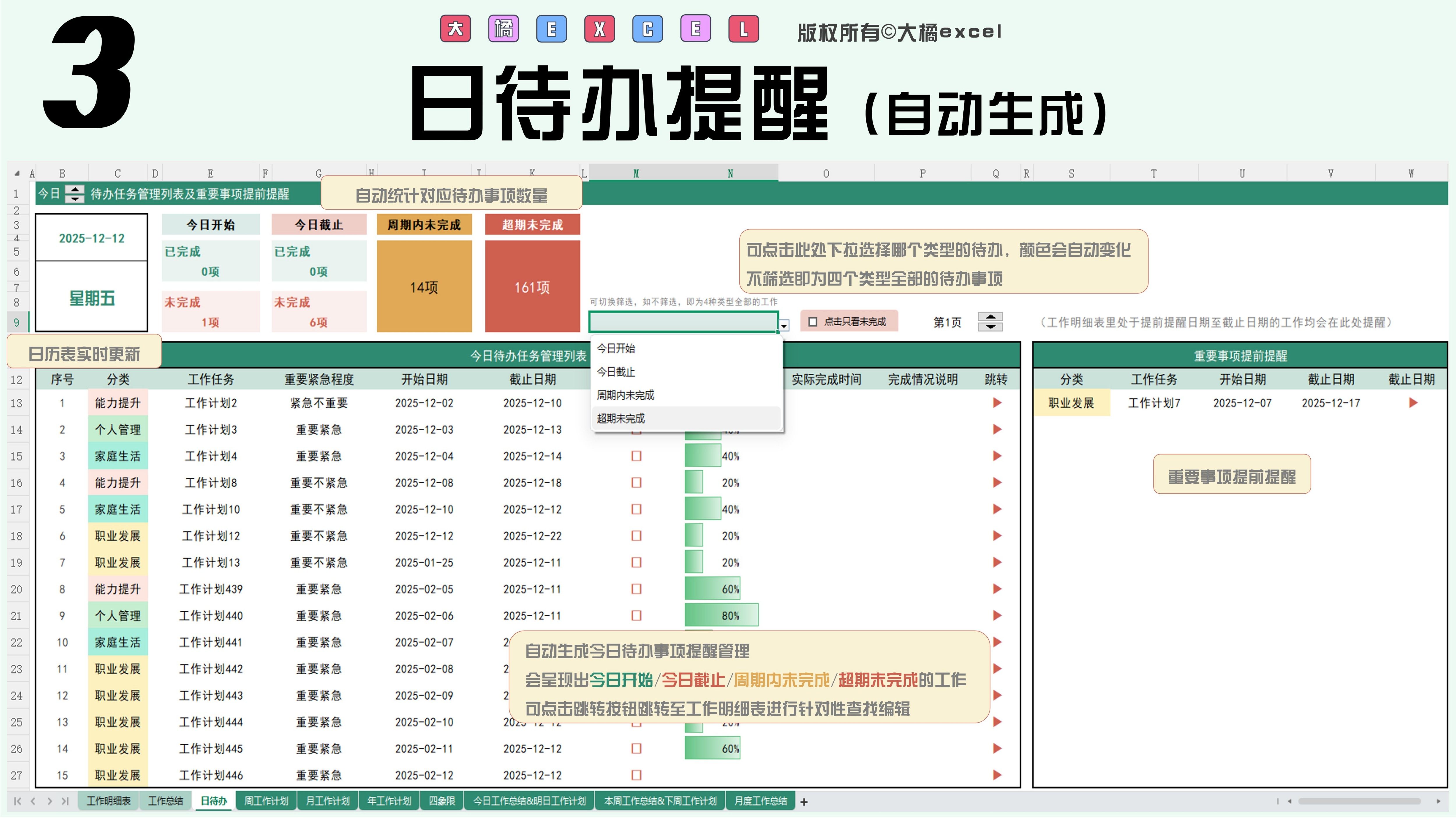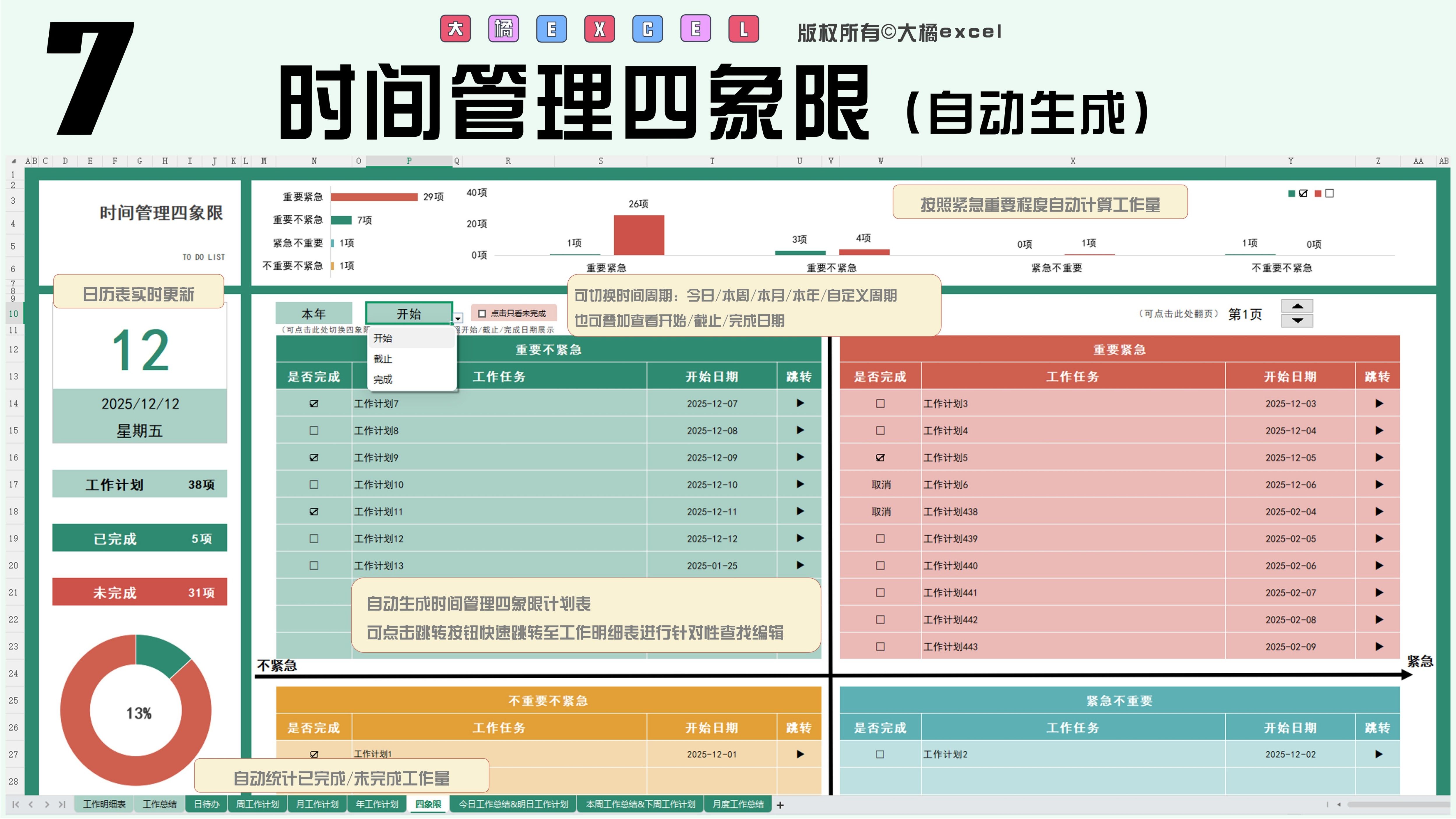 待办清单自动生成四象限/日/周/月/年计划/日周月总结