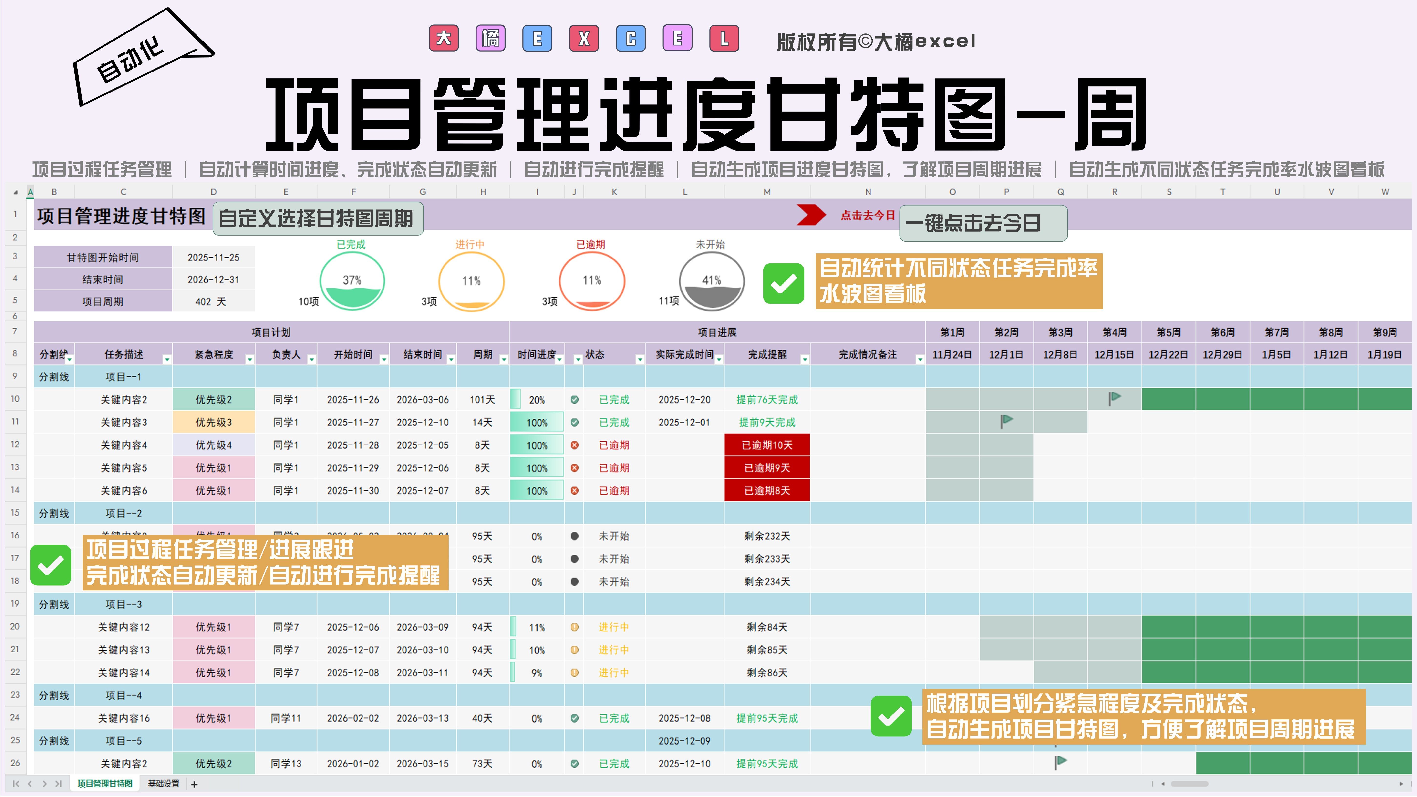 项目管理甘特图Excel表格进度横道图自动化跟踪