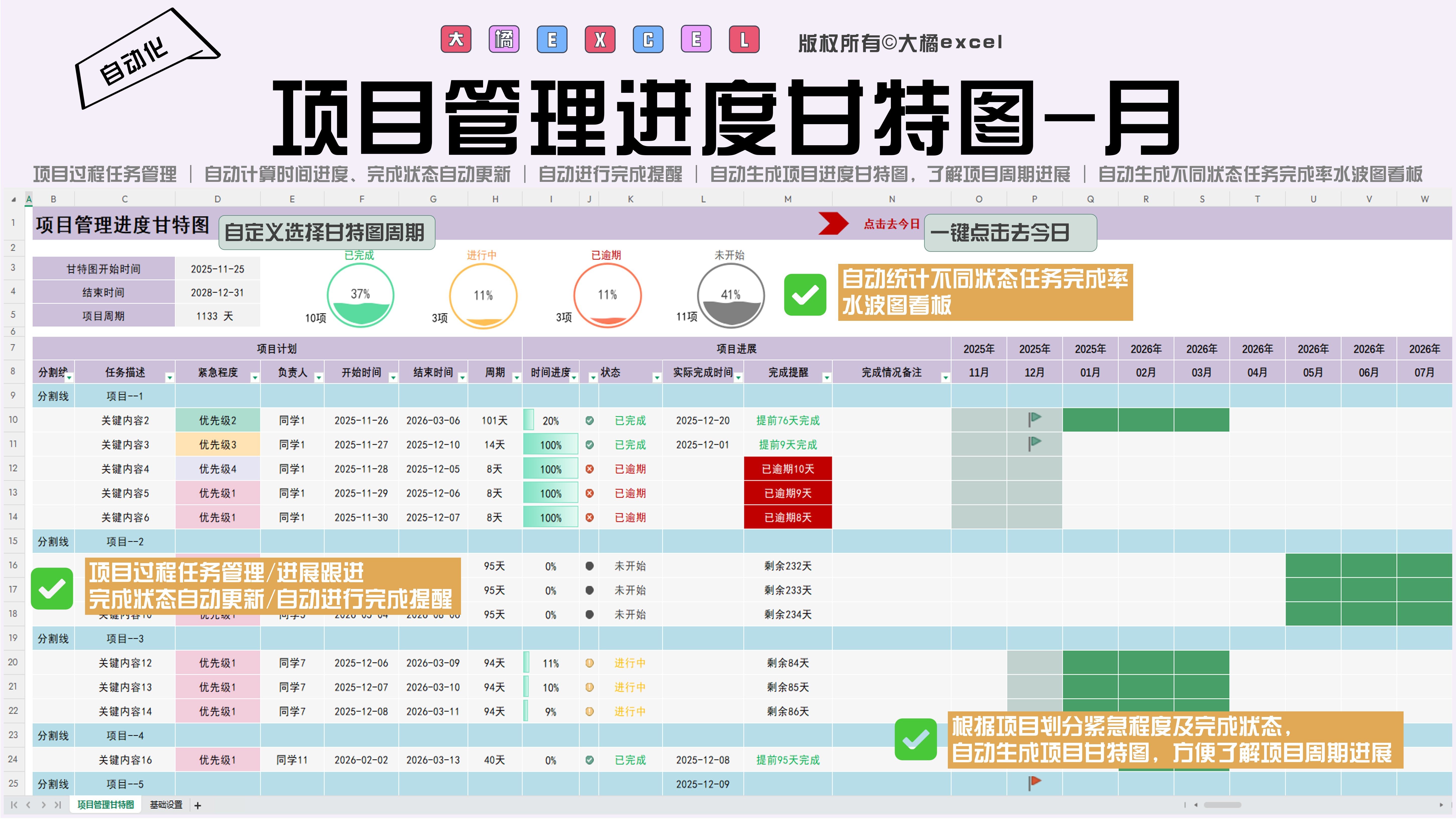 excel-项目管理进度甘特图模板(日+周+月进制版)