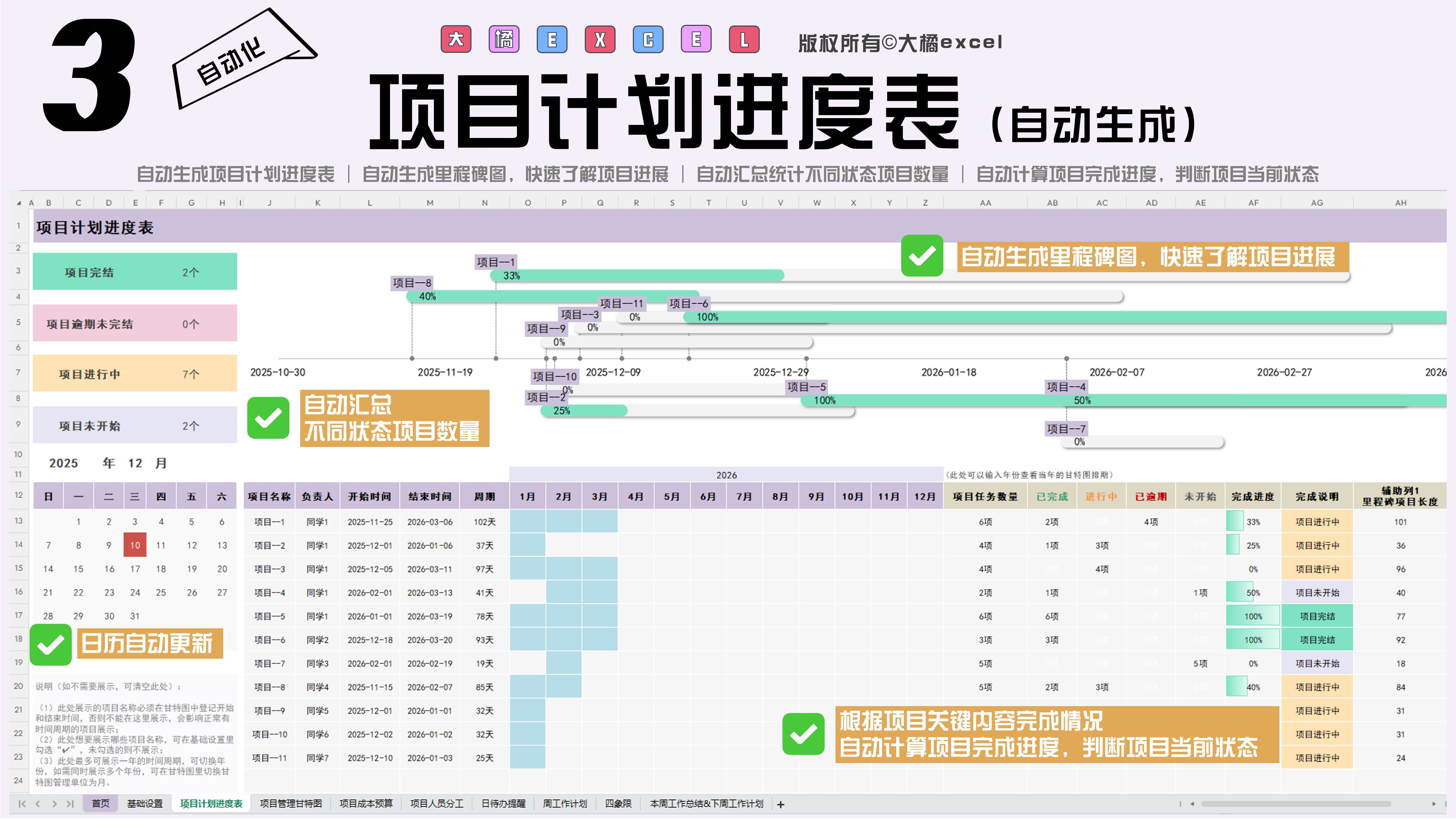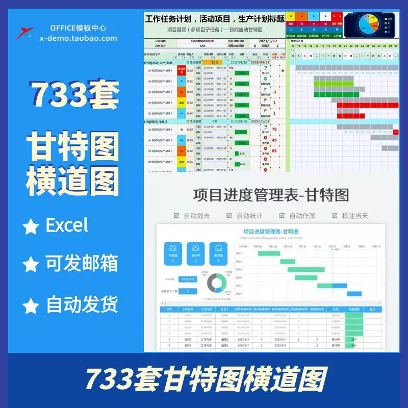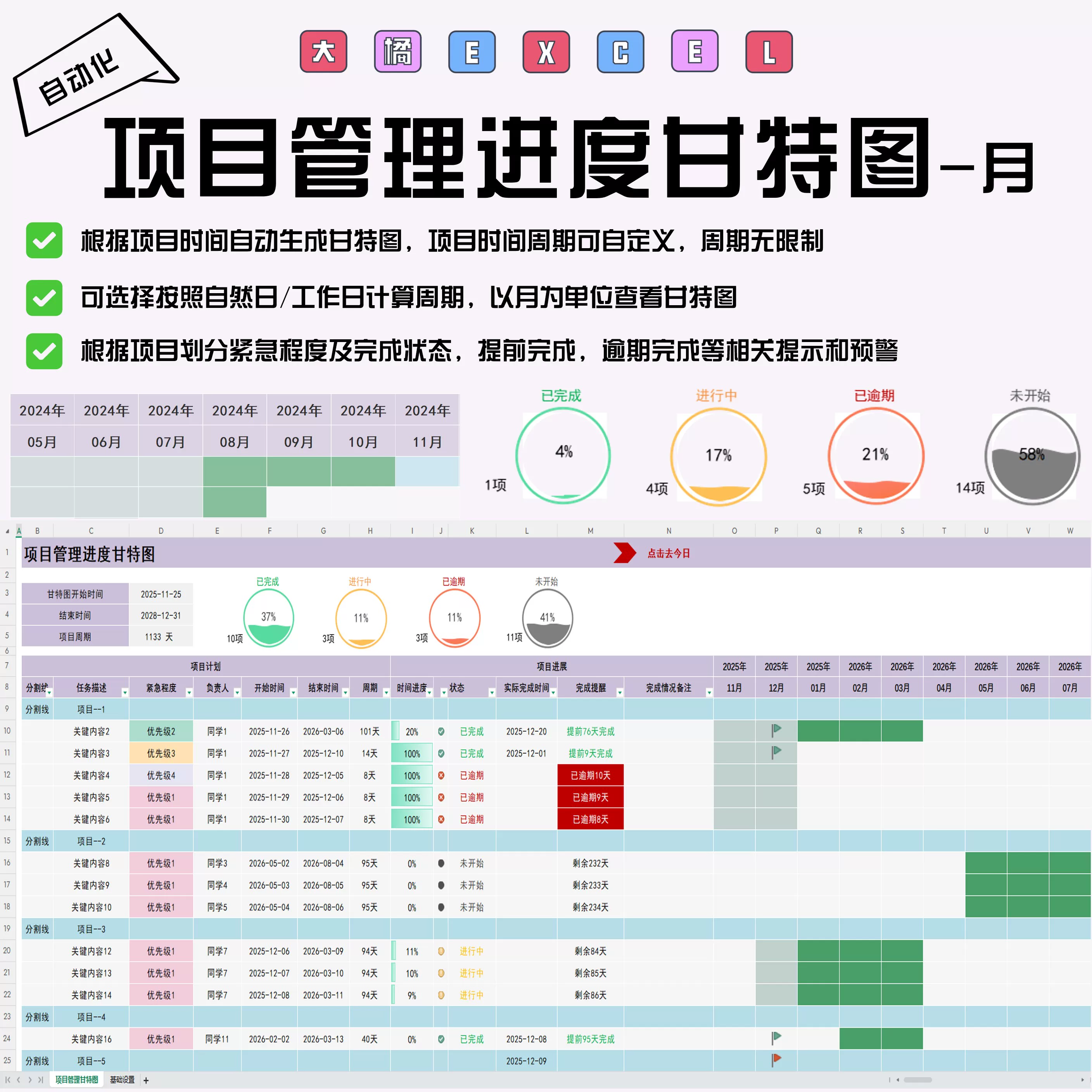 项目管理甘特图Excel表格进度横道图自动化跟踪