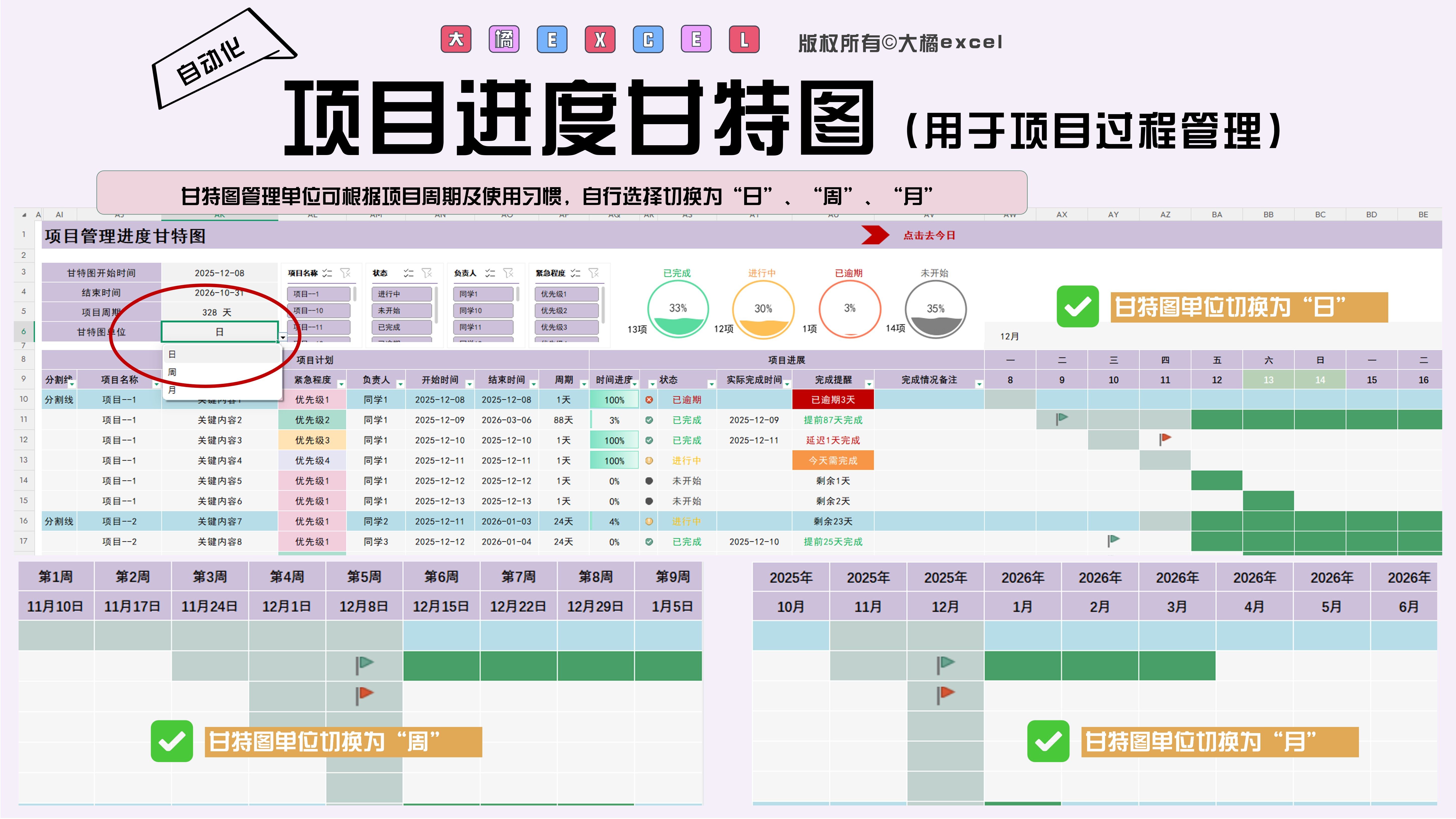 excel-项目管理进度甘特图模板(日+周+月进制版)